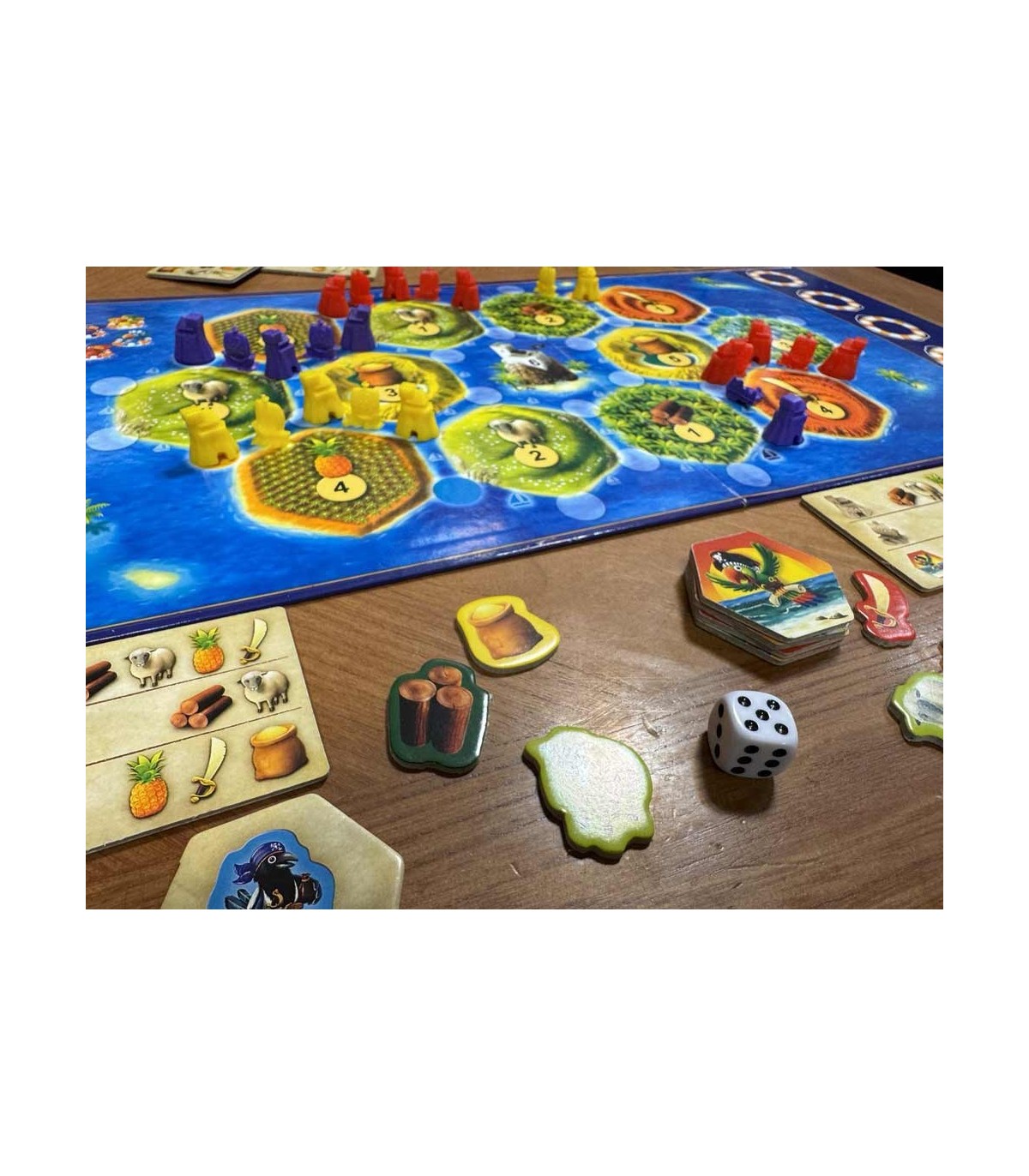 جزیره معدن آهن در سمت راست بالای صفحه نیز عدد 1 را نشان می دهد.بنابراین بازیکن زرد یک توکن شمشیر برای مقر دزد دریایی خود و بازیکن آبی سه توکن شمشیر برای 3 مقر دزدان دریایی خود دریافت می کند. جنگل در سمت راست پایین صفحه نیز عدد 1 را نشان می دهد. بنابراین بازیکن قرمز و بنفش هر کدام یک توکن چوب دریافت می کنند.